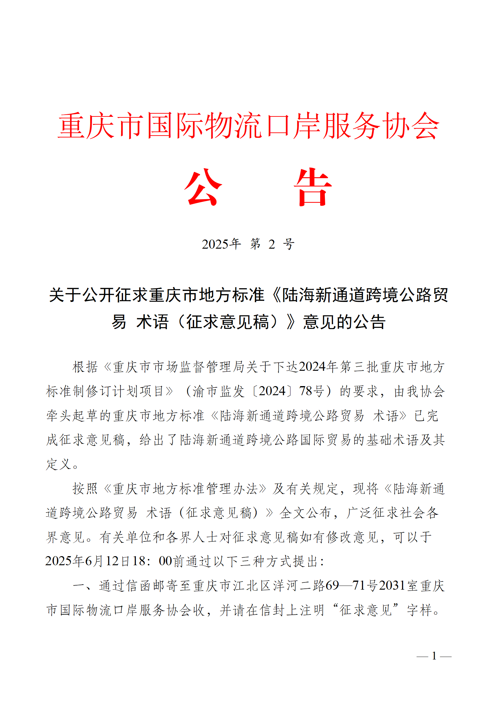 关于公开征求重庆市地方标准《陆海新通道跨境公路贸易 术语(征求意见稿)》意见的公告